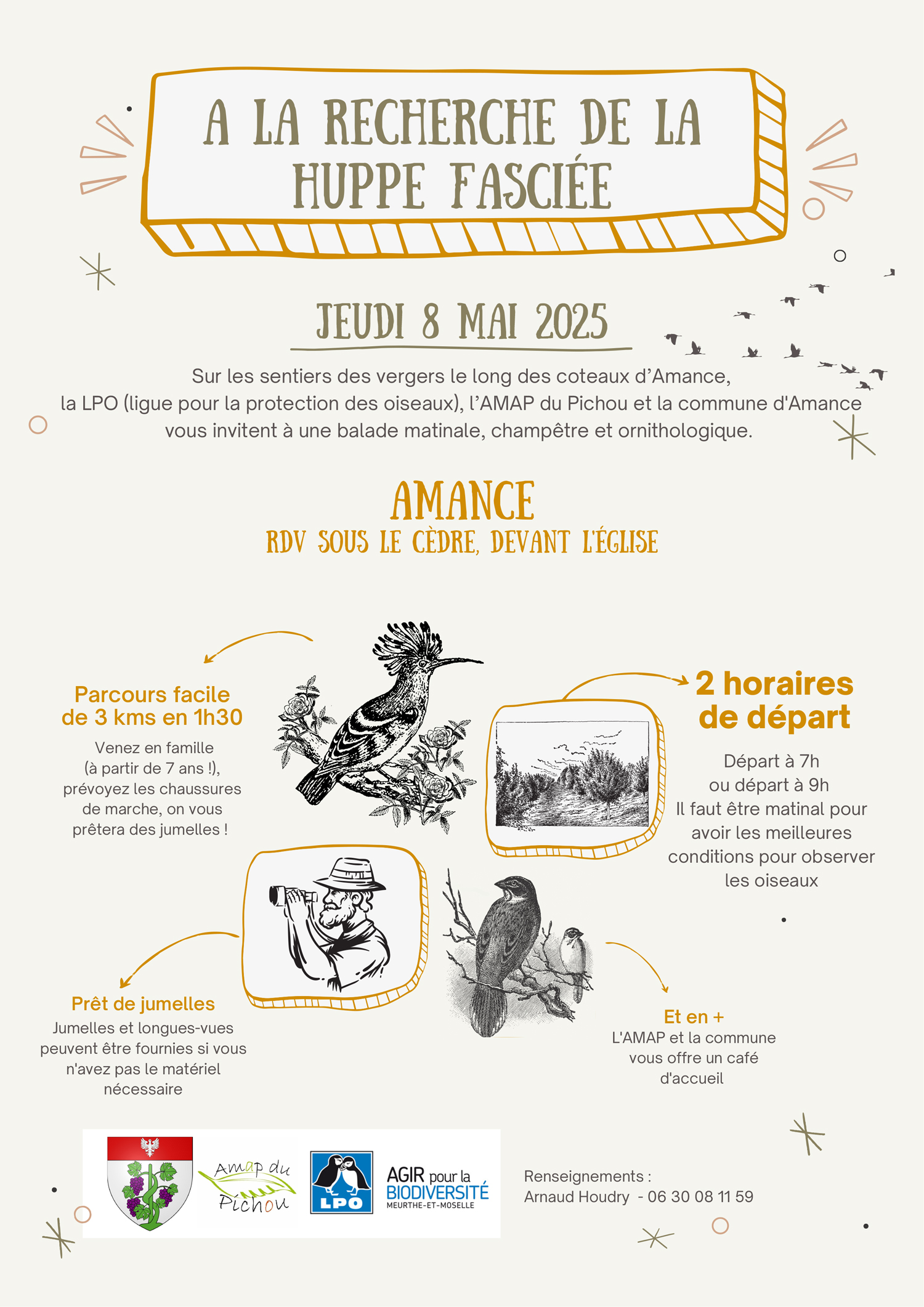 Jeudi 8 mai 2025, rendez-vous sous le cèdre devant l’église pour une balade sur les côteaux d’Amance à la recherche de la huppe fasciée.