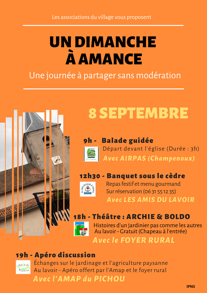 - 19h – apéro discussion avec l’AMAP du Pichou. Échanges sur le jardinage et l’agriculture paysanne. Au lavoir – Apéro offert par l’amas et le foyer rural.