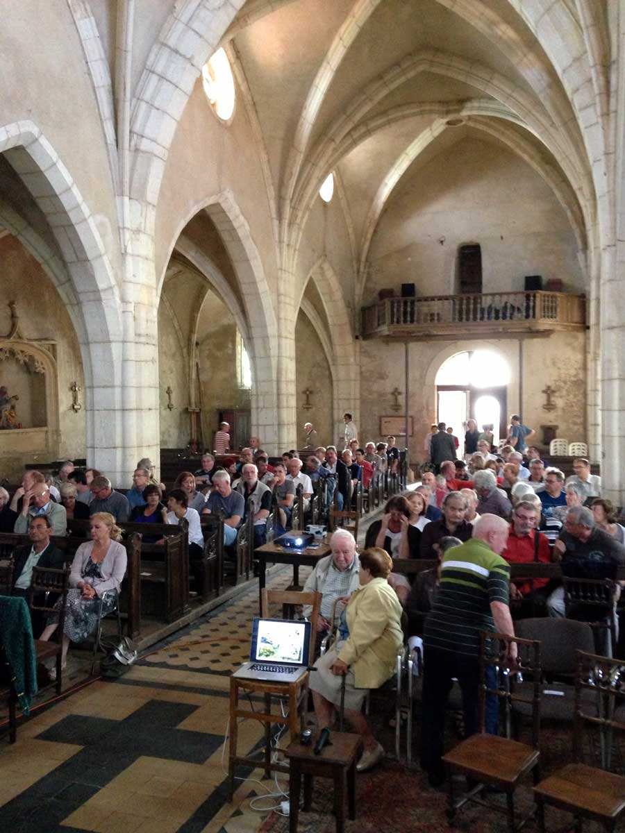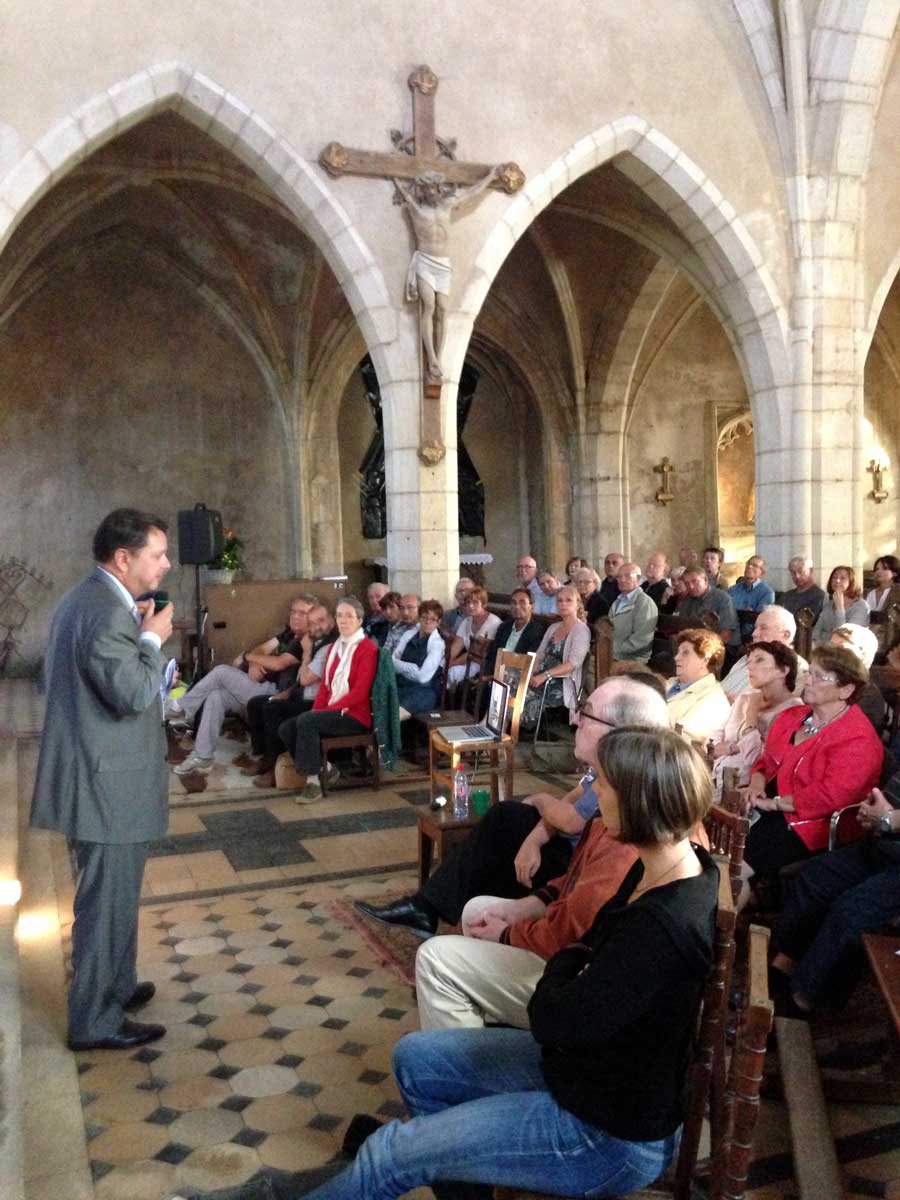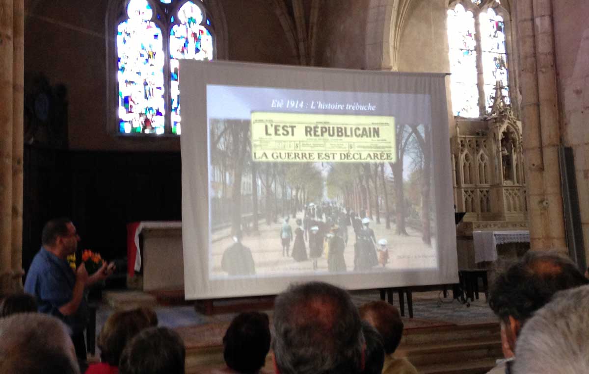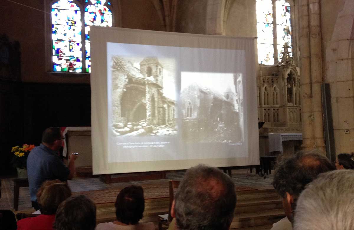 Illustrée par la projection de nombreux documents anciens, l’évocation des ces jours tragiques de septembre 1914 par Patrick-Charles Renaud a emmené un public très attentif au cœur des événements. Grand silence lors de la projection des photos de l’église et du village bombardés. Forte émotion collective aussi, lorsqu’Aline Bienaimé a lu des lettres de soldats ayant combattu ici, et dont le conférencier avait retrouvé la trace.