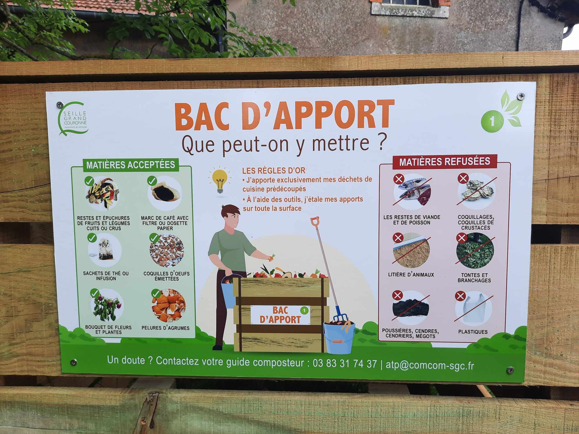 - le bac d’apport est destiné à l’apport des bio-déchets. Il est inscrit ce qu’il est possible d’y mettre.