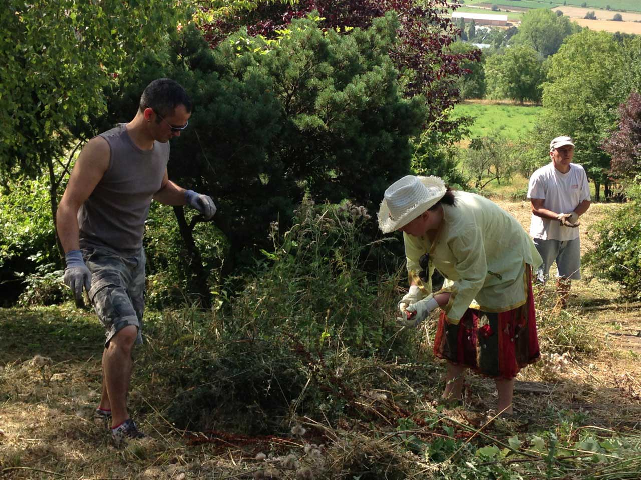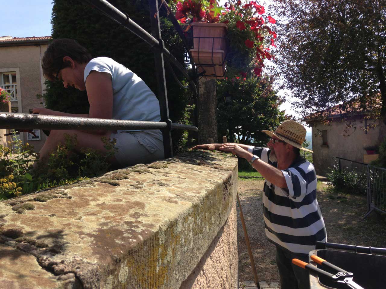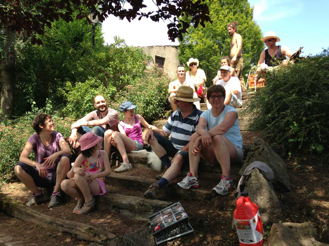 Bruno avait auparavant fauché le plus gros des herbes envahissant les divers étagements. Sous la houlette de Yann et Bruno, Alain, Stéphane, Marylène, Juliette, Alice, Josiane, Maïté, Isabelle, Fabien, Geneviève, Yann et Edouard ont dégagé ces petits « jardins suspendus » si agréables, retrouvant et revalorisant les beaux aménagements prévus initialement.