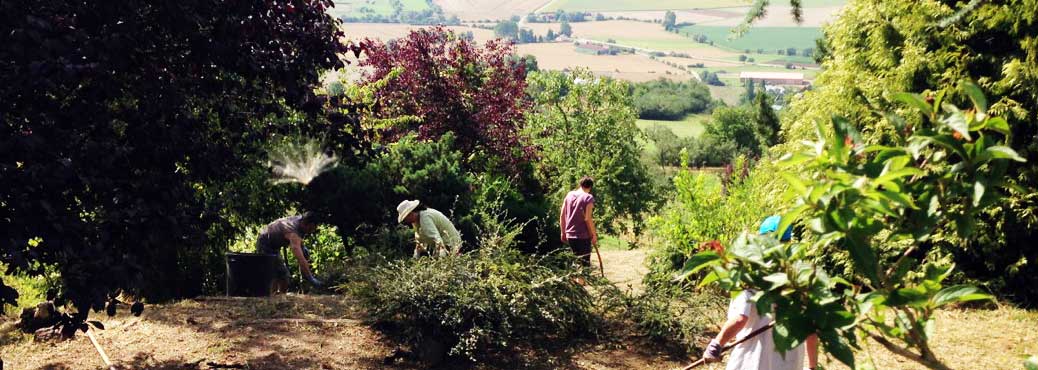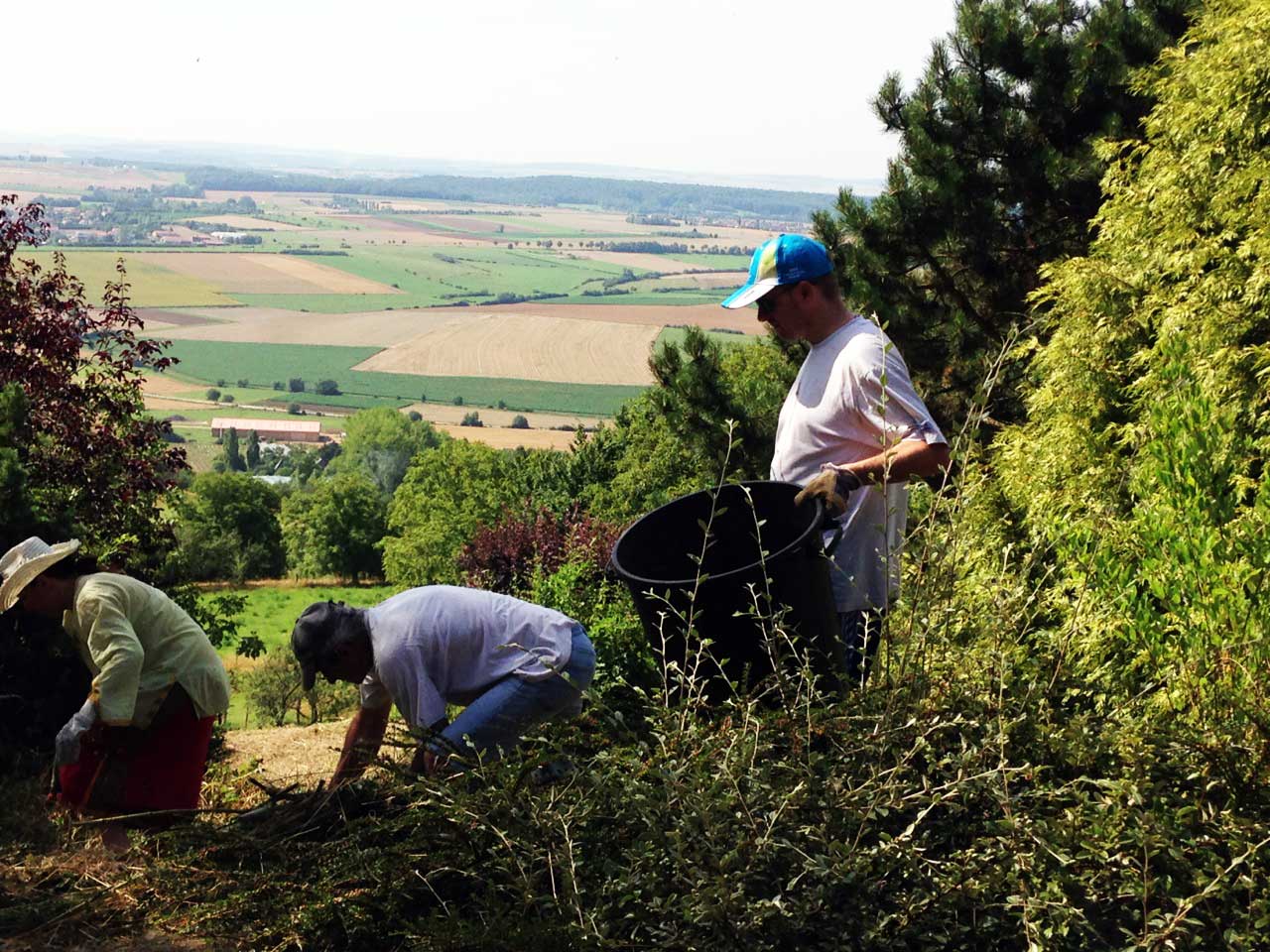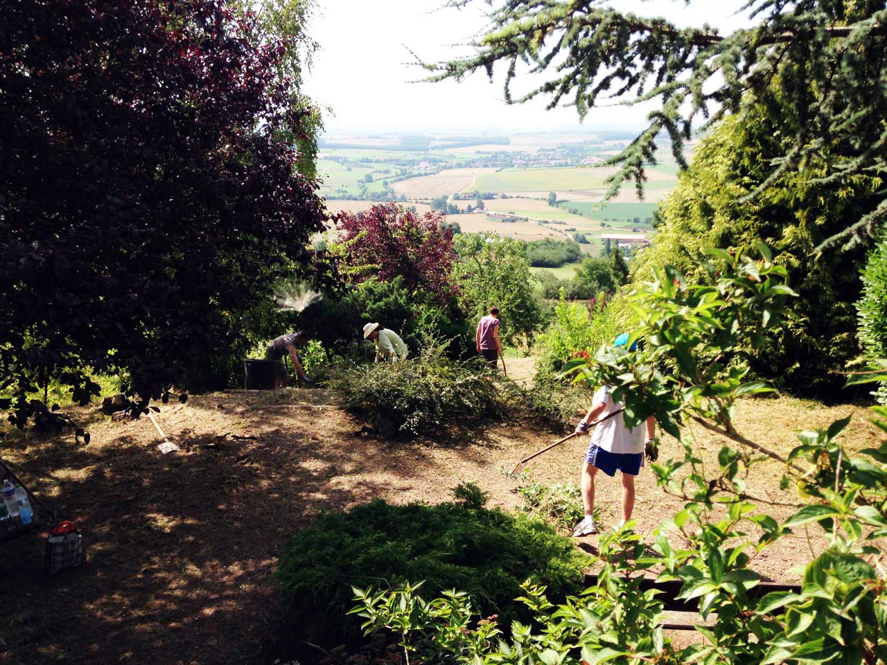 Bruno avait auparavant fauché le plus gros des herbes envahissant les divers étagements. Sous la houlette de Yann et Bruno, Alain, Stéphane, Marylène, Juliette, Alice, Josiane, Maïté, Isabelle, Fabien, Geneviève, Yann et Edouard ont dégagé ces petits « jardins suspendus » si agréables, retrouvant et revalorisant les beaux aménagements prévus initialement.