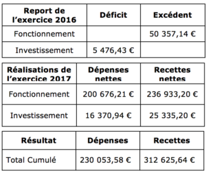 La réalisation à la baisse des dépenses de fonctionnement par rapport au budget est notamment liée à des dépenses d’électricité moins importantes que prévu et des travaux de voirie reportés en 2018. De plus, les charges de personnel « emploi aidé » sont moins fortes du fait de la rupture prématurée du contrat de Julien. Il n’y a pas eu de FPIC en 2017 et il ne devrait pas y en avoir non plus en 2018.