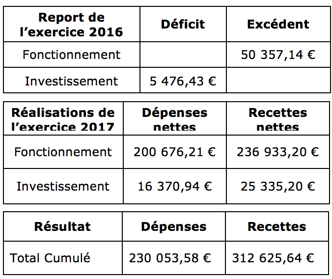 Le Compte Administratif 2017 voté précédemment laisse apparaitre un excédent de fonctionnement de 86 614,23 € et un excédent d’investissement de 3 487,83 €