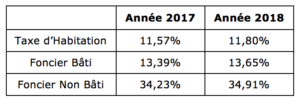 Il est proposé aux élus une augmentation de 2% des taxes locales afin de disposer des ressources permettant de poursuivre les travaux d’aménagement de la commune tout en limitant au maximum l’appel à l’emprunt. Cette augmentation permet également de maintenir l’effort fiscal et de pouvoir ainsi solliciter d’autres aides publiques. Cette augmentation porte les taxes aux niveaux suivants :