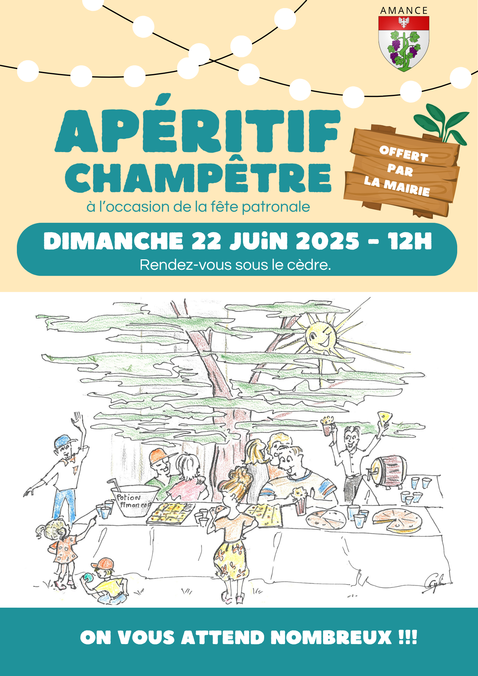 « Tous les Évènements Cet évènement est passé. Apéritif champêtre 22 juin à 12 h 00 min - 13 h 00 min « Exposition « Nos beautés secrètes » Petit déj débat » Rendez-vous, dimanche 22 juin 2025 à 12 h, sous le cèdre pour partager un apéritif à l’occasion de la fête patronale. Ajouter au calendrier Google Agenda iCalendar Outlook 365 Outlook Live Détails Date : 22 juin Heure : 12 h 00 min - 13 h 00 min Organisateur Mairie Lieu Centre du village