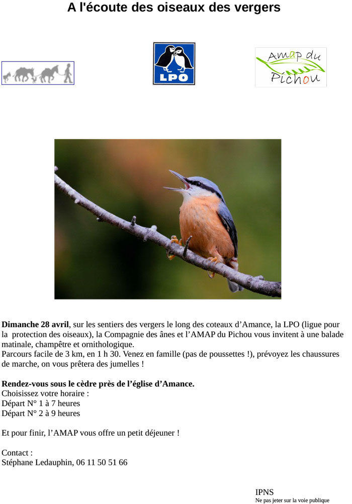 Dimanche 28 avril, sur les sentiers des vergers le long des coteaux d’Amance, la LPO (ligue pour la protection des oiseaux), la Compagnie des ânes et l’AMAP du Pichou vous invitent à une balade matinale, champêtre et ornithologique.