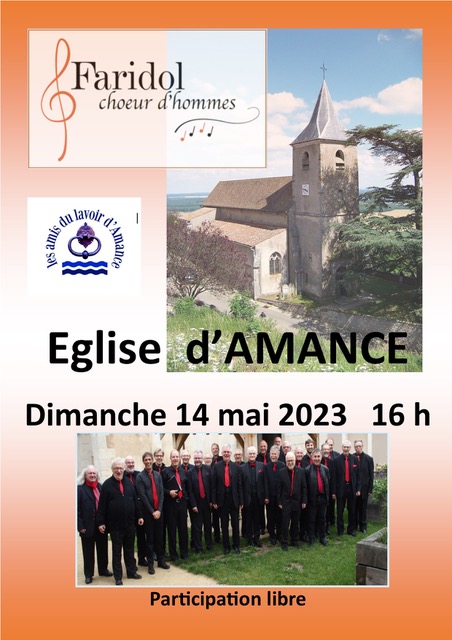 Les amis du lavoir d’Amance vous invitent à découvrir le chœur d’hommes FARIDOL, qui sera en concert le dimanche 14 mai à 16 h à l’église d’Amance.