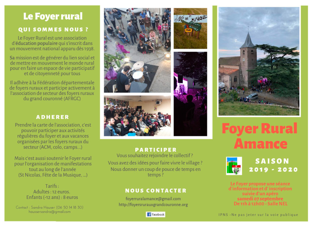 Le Foyer Rural d’Amance propose une séance d’information et d’inscription suivi d’un apéro le samedi 07 septembre 2019, salle NEL, de 11h à 12h.