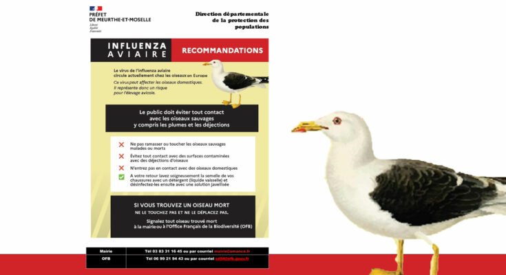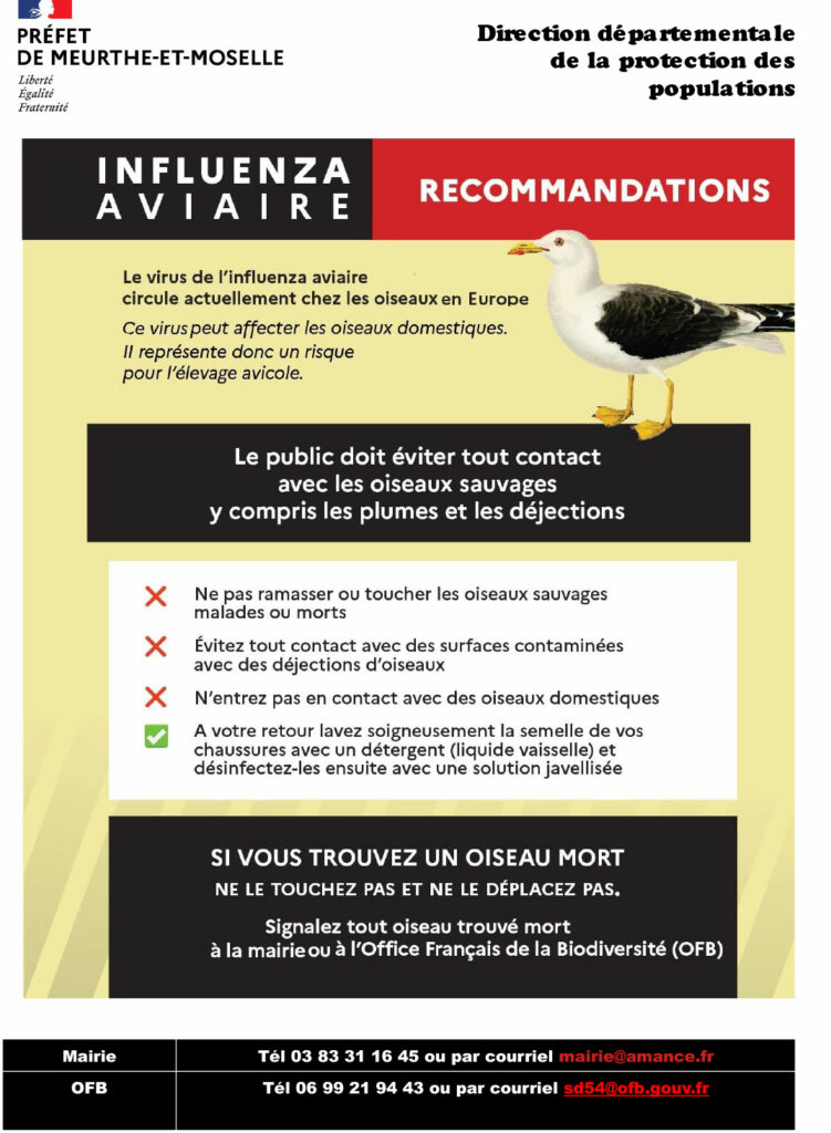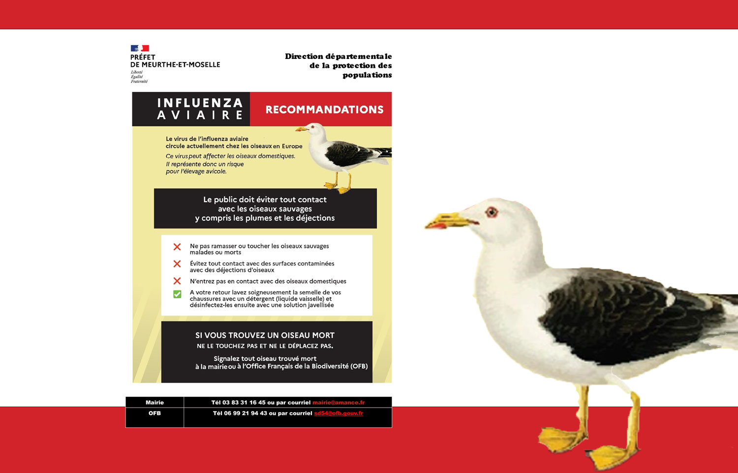 En cas de découverte d’un oiseau mort, notamment les oiseaux d’eau sauvages et les rapaces, il peut être conseillé de contacter l’Office français de la biodiversité (OFB) au 06 99 21 94 43 ou par courriel au sd54@ofb.gouv.fr