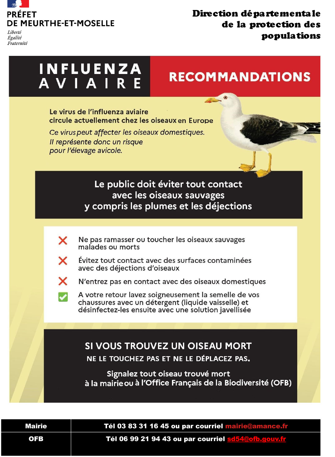 Le préfet de Meurthe-et-Moselle a pris un arrêté visant à prévenir l’apparition d’influenza aviaire dans les élevages. Une zone de contrôle temporaire (ZCT) de 20 Km autour du lieu de découverte des oiseaux infectés a été définie pour une durée minimale de 21 jours. Cette zone de protection inclut 106 communes de Meurthe-et-Moselle dont Amance.