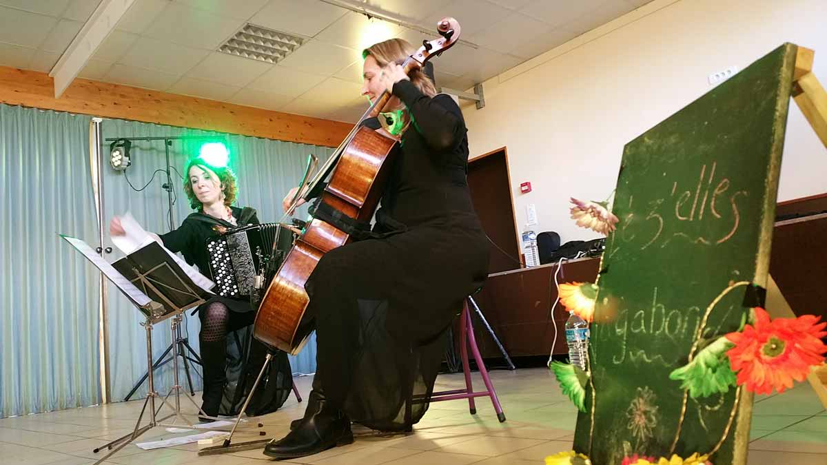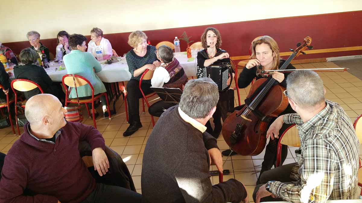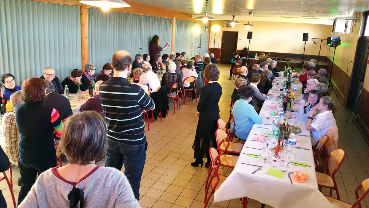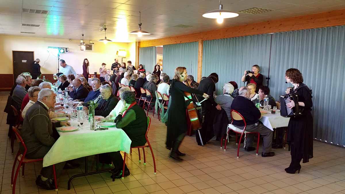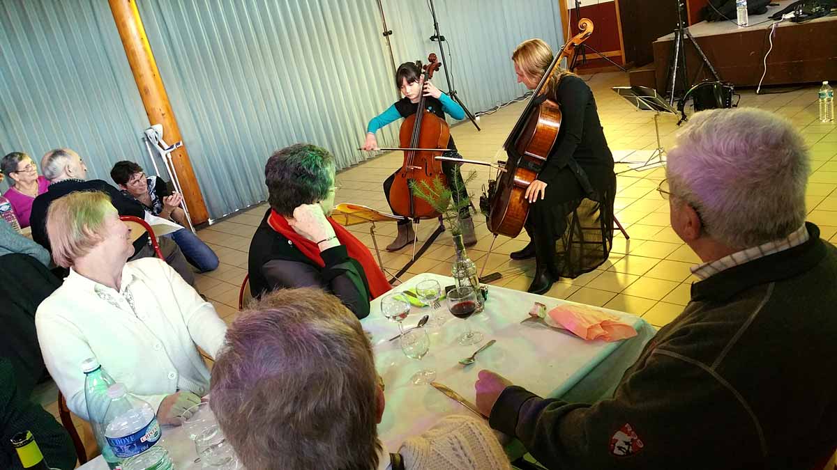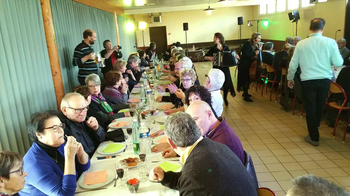 Les 68 convives ont pu apprécier le repas et profiter de l’ambiance musicale assurée par les Z’Elles Vagabondes, un duo mélangeant accordéon, violoncelle et voix, avec des chansons d’hier et de toujours.