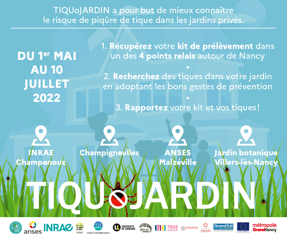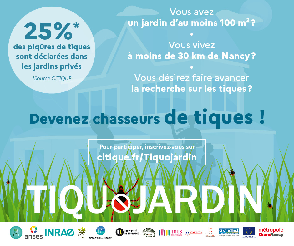 Le projet TIQUoJARDIN fait appel aux citoyens volontaires possédant un jardin de plus de 100m² et vivant sur les communes du Grand Nancy et alentours, pour caractériser les risques liés aux tiques dans les jardins privés. Notre commune XXX y contribue en invitant ses habitants à participer !