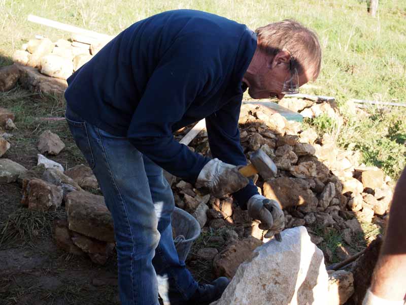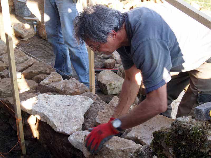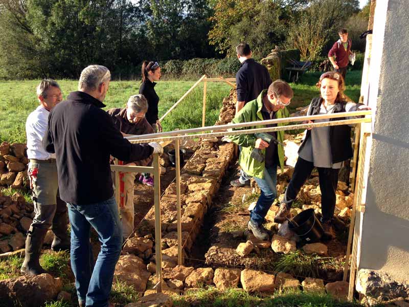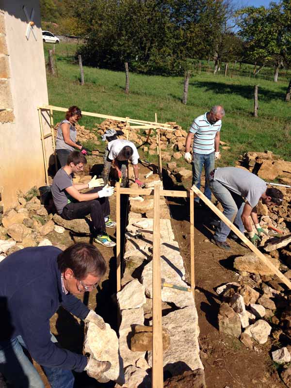 Ou plus exactement, on le refait ! Ce mur au sud du lavoir du revers était éboulé en partie. Dans le cadre d’un stage organisé par les Amis du lavoir, les samedis 11 et 18 octobre, huit personnes ont commencé à le reconstruire, tout en apprenant la technique « murs en pierres sèches » avec leur formateur Alain Bienaimé (c’est lui qui a réalisé le splendide mur sous la terrasse de l’église côté sud).