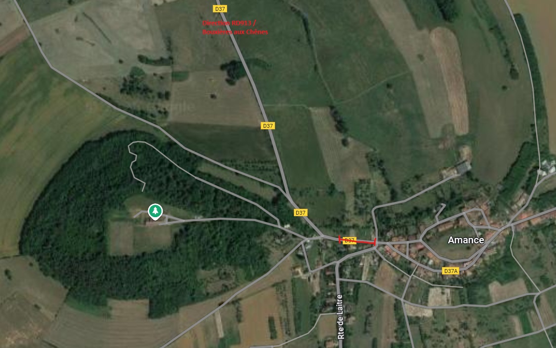 Fermeture de la route : La route sera complètement barrée pendant toute la durée des travaux, au niveau des habitations situées entre le 1 route de Bouxières-aux-Chênes et le 6 rue de la Porte en Bas à Amance. La traversée du village par la RD913 sera impossible.